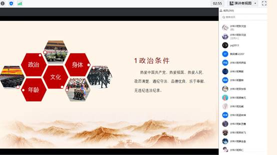 (通讯员:干海昕)携笔从戎,逐梦军旅。为贯彻落实国家征兵政策,扎实推进征兵工作,12月15日晚,计算机科学学院召开线上征兵政策宣讲暨动员大会。本次活动由计科学院征兵专干——郭帅老师主持,退役大学生肖雄、喻文辉主讲,各年级有意向参军同学参加会议。