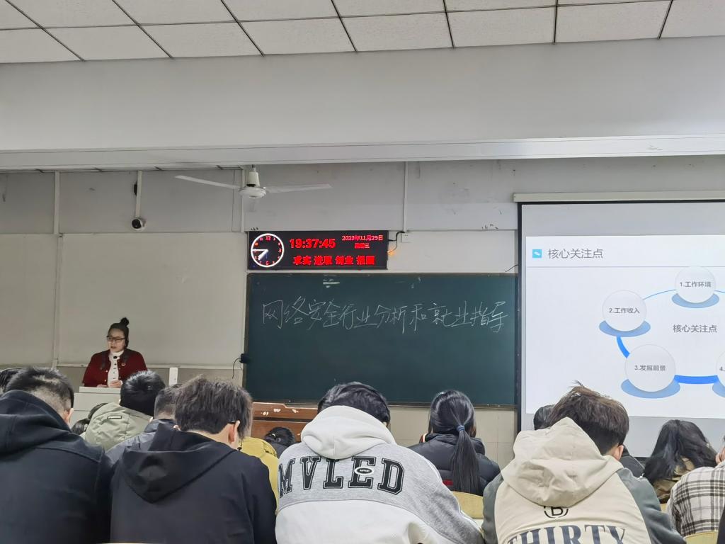 通讯员 余珺瑞 高昕计算机科学学院于2023年11月29日晚上7点,在12教104教室举办了一场以“网络安全发展形势与就业指导”为主题的讲座。本次讲座特邀奇安信集团校企合作部副总监总监闫军霞女士主讲由网络工程系副主任胡蓉华负责主持。计算机科学学院副院长陈中举、信息安全专业潘劲松老师以及200余名同学参加。