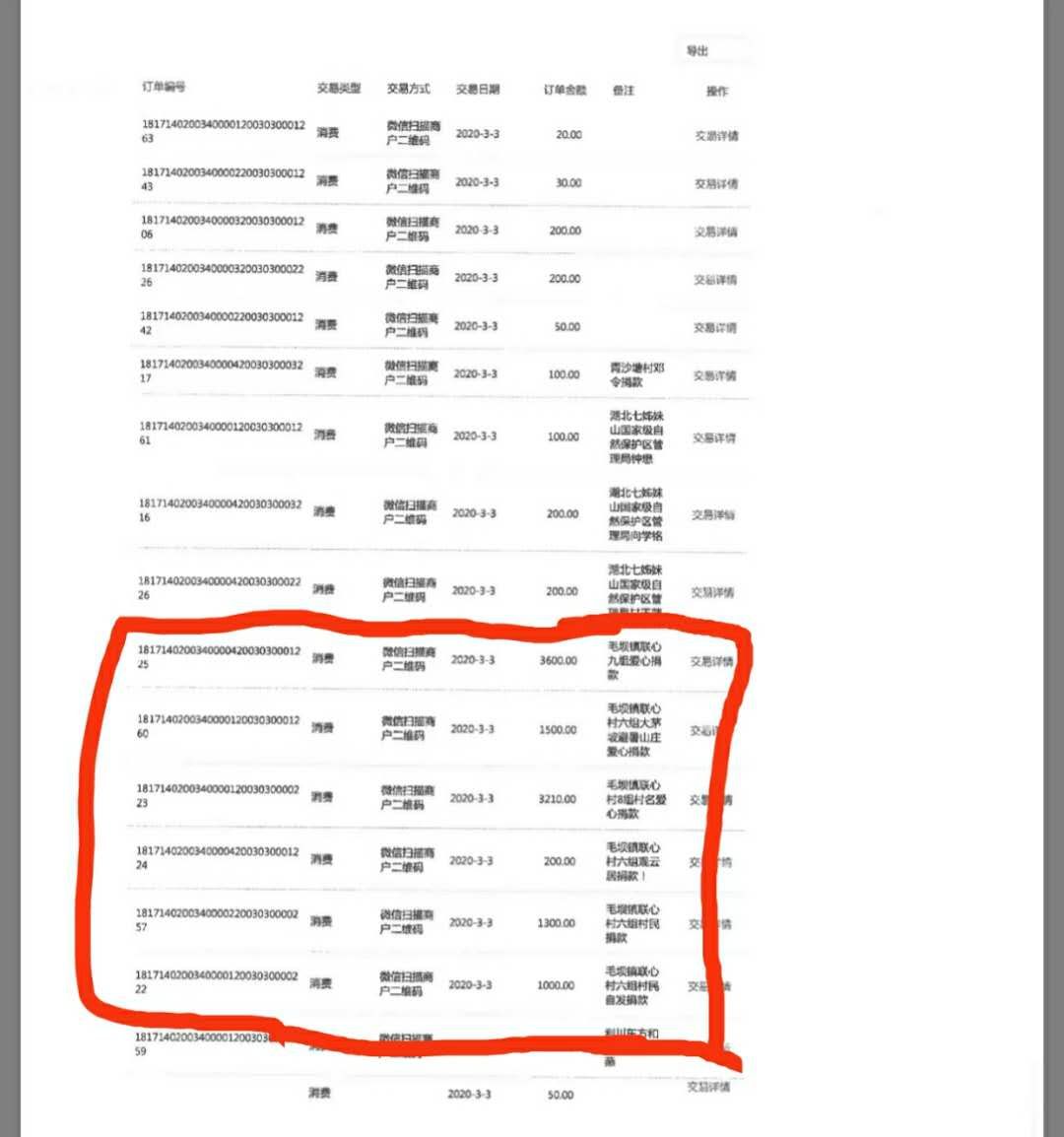 他每天和村医每家每户测为村民测体温,统计每周全村购买物资的名单,为低保户家里搬运粮食。一天天的微信步数步数通常以万起步,但是他从来没有觉得累。他说:“身为人民子弟兵,要为人民服务。”3月3号当得知县里指定救治新冠病毒医院奇缺物质。他在村里挨家挨户发起募捐并通过自己的战友同学筹资一万余元交给利川红十字会。每人一滴水,就可以汇成江河;每人一份力量,就可以战胜疫情!