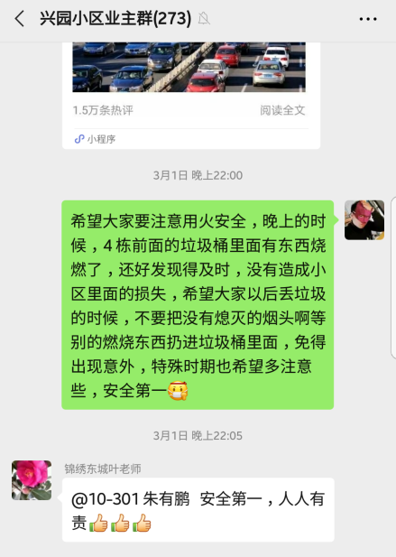 在一次巡逻时,他发现小区内一处垃圾桶燃烧起来,立即带头组织救火,在根本上断绝火源,从而保证了人民群众的生命财产安全。并立即在社区各群中,强调用火安全,让社区居民提高安全防范意识。在面对这一突发事件时,朱有鹏同学沉着冷静、有条不紊的处理方式得到了社区领导以及全体小区居民对他工作的认同和赞赏!他也在此次疫情防控工作中得到迅速的成长和进步!