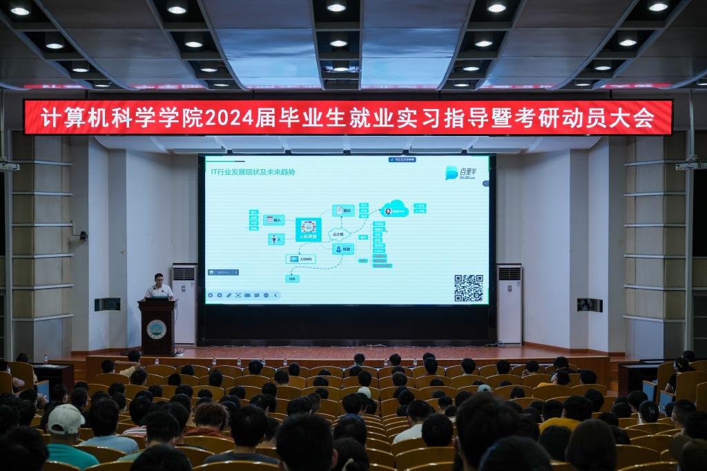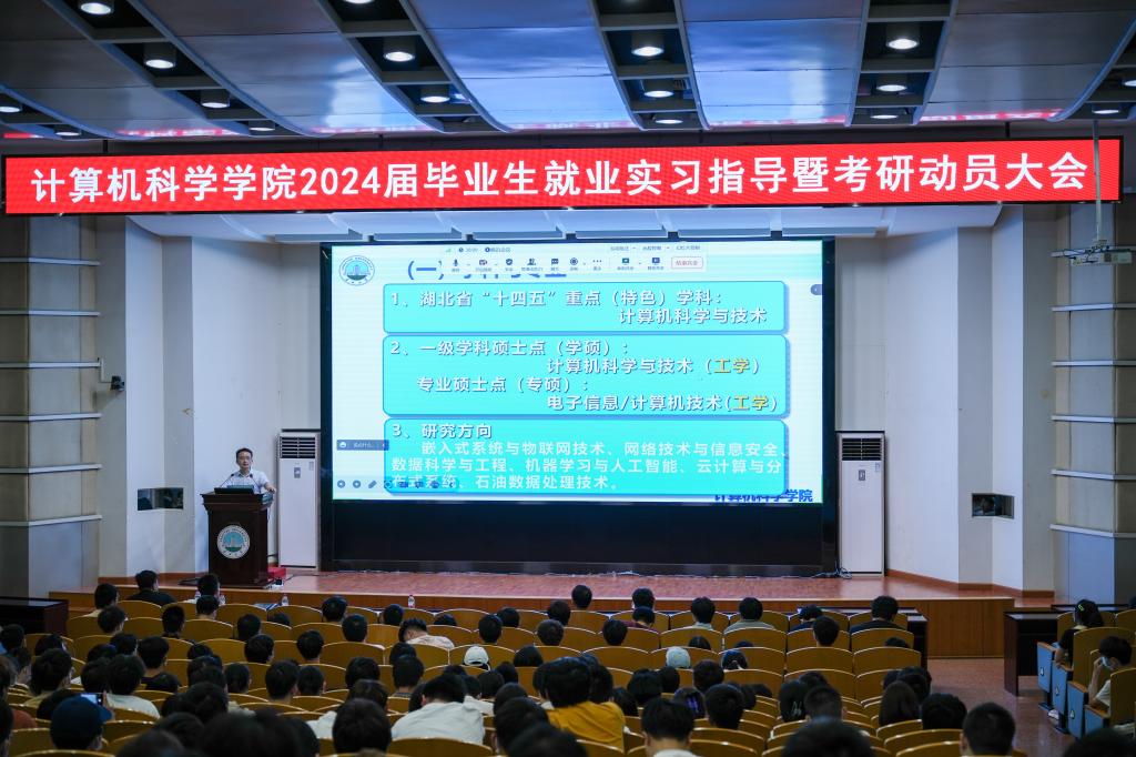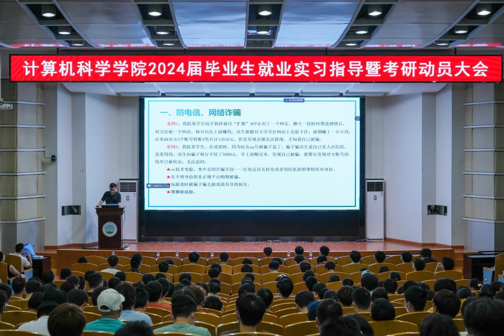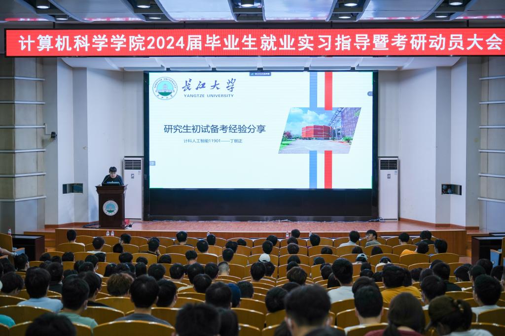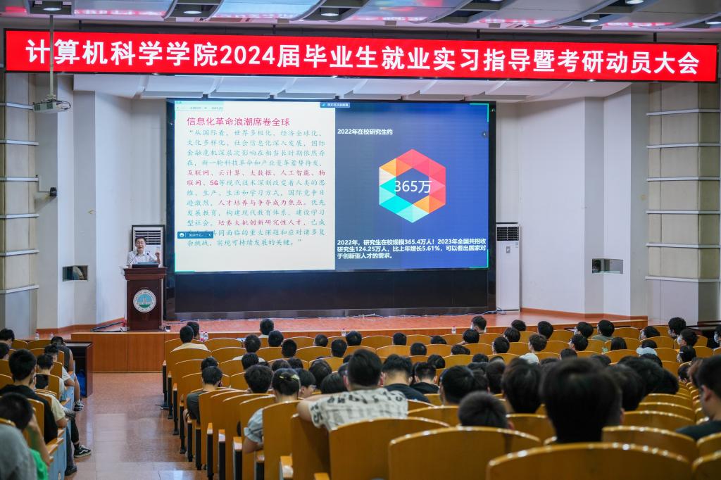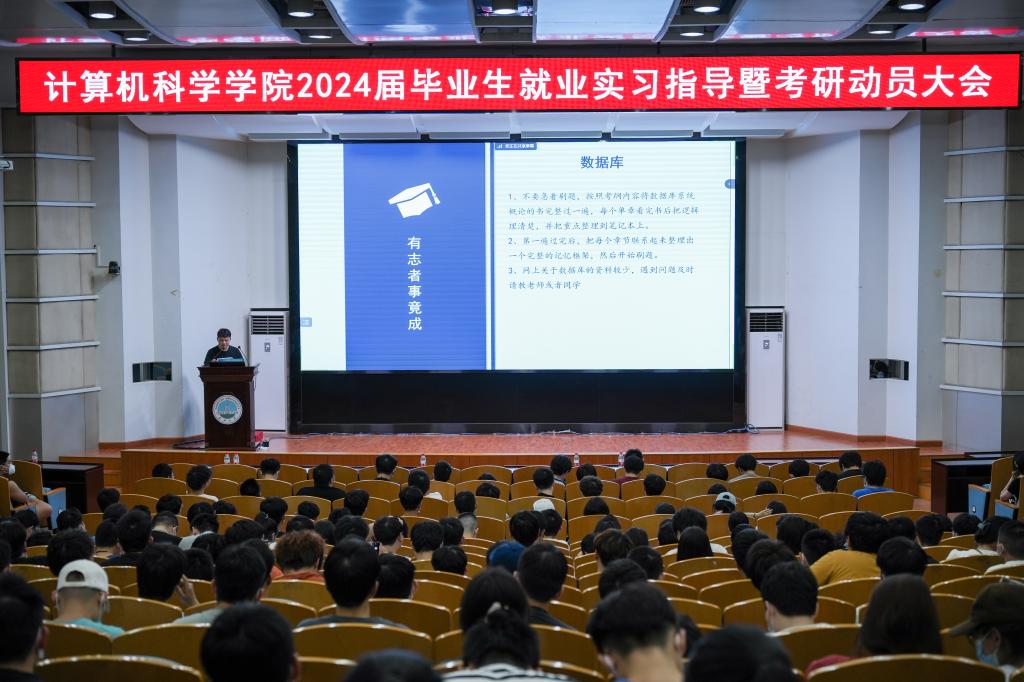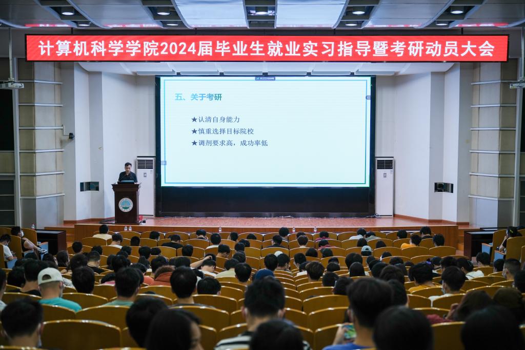 (通讯员 王洵/摄 高滢/文)2023年5月31日,计算机科学学院在12教405报告厅和12教404教室召开2024届毕业生就业实习指导暨考研动员大会。学院党委副书记颜学俊,副院长詹炜、宋文广,学工办主任付盈,就业专干余珺瑞,2020级辅导员高滢以及2024届毕业生参加会议。会议由颜书记主持。