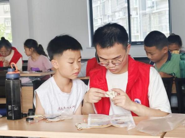 智科12302班左颖暄同学参加了家乡的爱心托管班活动,并将“多元课堂”搬进了班级中:防溺水用情景剧演练,一句“远离野外水域”被孩子们喊成口号;剪纸课请来非遗师傅,红纸一翻就是一只活灵活现的兔子;书法课手把手纠正孩子们的握笔姿势,并邀请眼科医生带着眼球模型讲护眼。她最欣喜的是,起初握笔姿势总出错的小男孩,最后也能举起纸向她骄傲地展示他的作品,眼里的光比窗外的阳光还要明亮。“那一刻我明白,教育不是灌满,而是一起点亮。”
