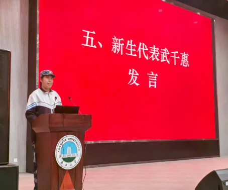 新生代表、计科32510班武千惠在发言中展现出昂扬向上的青春风貌,呼吁全体新生主动适应身份转变,保持专业热情与技术好奇心,以“永不言退”的劲头不断超越自我,在探索中绘制独特人生蓝图。
