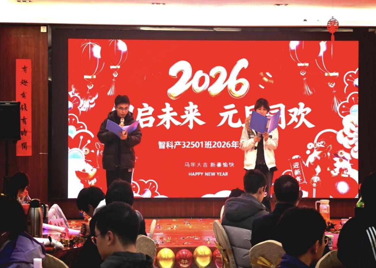 肇始新元之际,12月29日晚,智科产32501班“智启未来,元旦同欢”元旦晚会顺利举行。班主任崔艳荣、党委书记郑健及学院领导班子、全体辅导员与智科产全体学生欢聚一堂,围坐共赏这场充满青春气息与温情氛围的视听盛宴,共同迎接新年的到来。