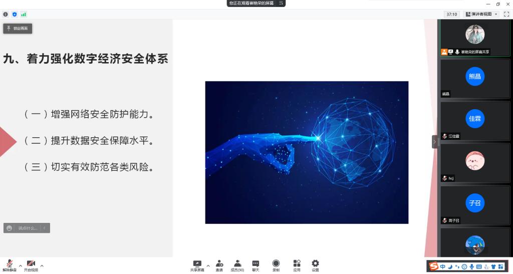 2022年4月21日下午,计算机科学学院院长崔艳荣以《“十四五”数字经济发展规划》为题作形势政策报告,学院一二年级研究生通过腾讯会议参会。
