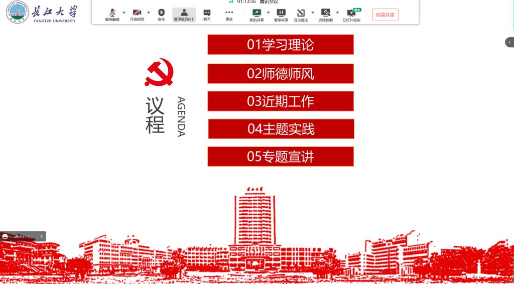 黄书记针对近期疫情防控形势,对大家提出三点要求:一是认真学习习近平总书记在中国共产党第二十次全国代表大会上所作的报告和发表的重要讲话精神;二是严格遵守《长江大学新冠肺炎防控指挥部通告(2022年第7号)》、《关于进一步加强校园管控措施的通知》等规定,不抱怨、不逃避、不松懈,落实四方责任;三是党员干部就近下沉所在社区(小区),参加志愿服务,鼓励非党员教职工参与社区疫情防控。