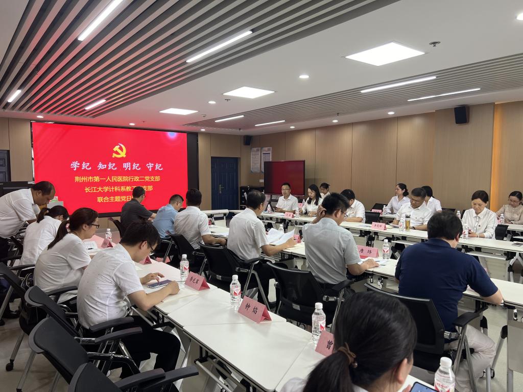 为深化党纪学习教育成果,进一步发挥党建政治引领作用,7月3日下午,由荆州市第一人民医院党委书记李茂坤同志带领院行政二党支部全体党员与长江大学计算机科学学院计科系教工党支部在文科大楼1008会议室联合开展了“学研互促,打造产教融合高素质党员队伍”主题党日活动。长江大学党委常委、副书记、副校长杜国锋,计算机科学学院党委书记郑健同志参加主题党日活动。